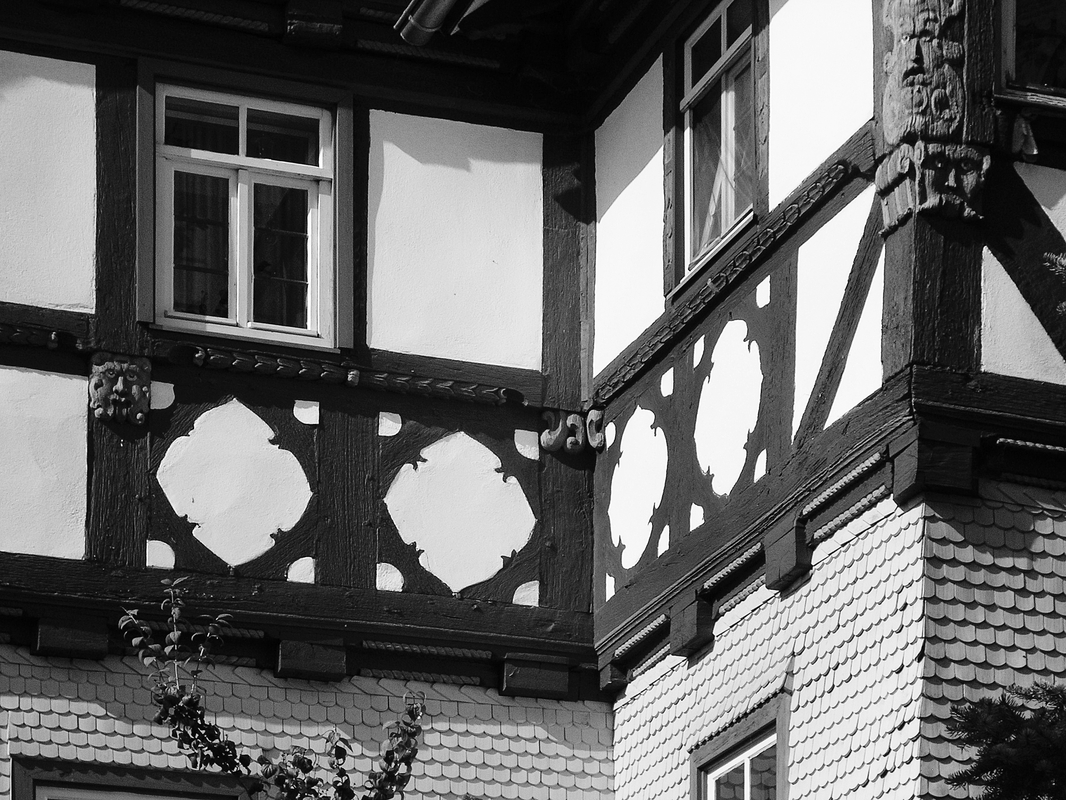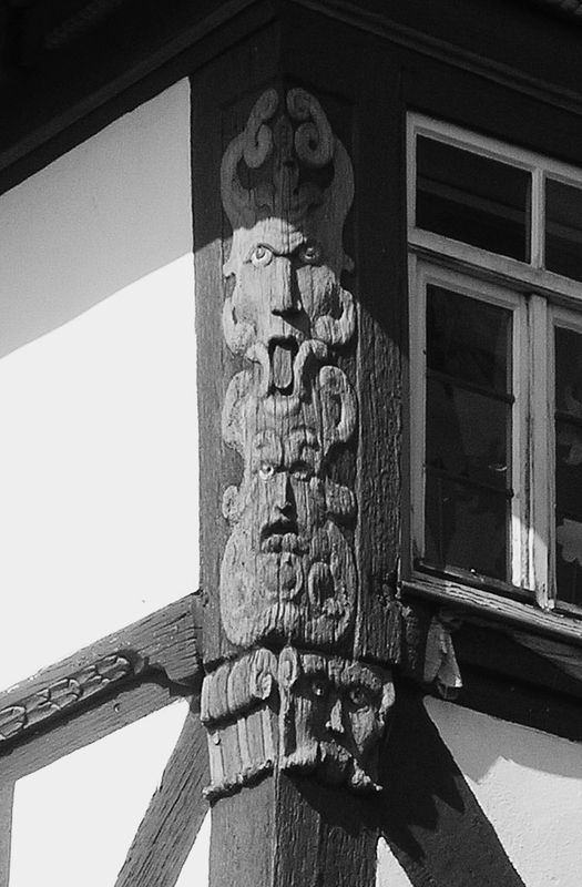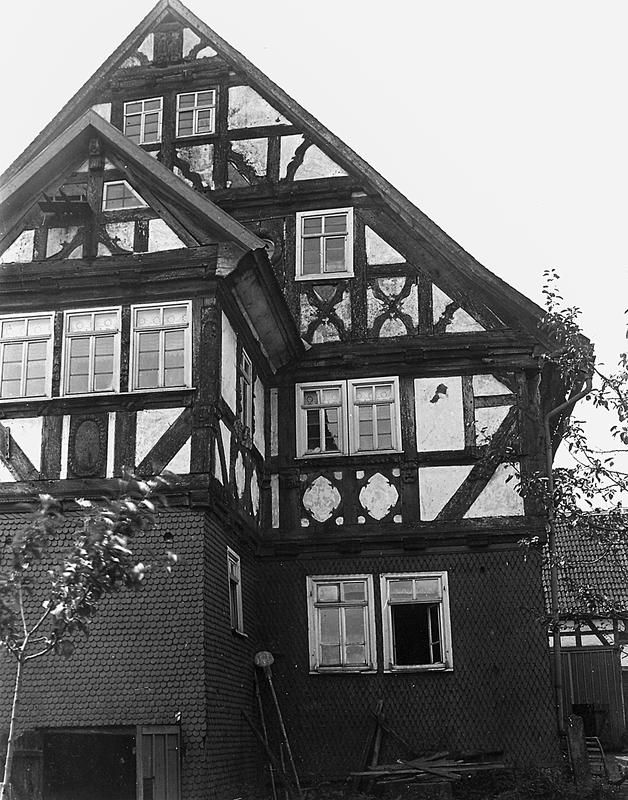 Das Haus ist im Kern 11 zu 20 Gefache groß. Erdgeschoss und Rückwand haben Schindelverkleidungen. Die zur Straße gerichtete Giebelseite wird mittig durch einen schmalen Vorbau mit eigenem Satteldach erweitert. Das Grundgerüst ist schlicht: Es ist nur an den Eckständern durch kräftig ausgebildete Mann-Figuren mit kurzen Halsriegeln verstrebt. Charakteristisch ist "die Verstärkung der oberen Wandteile, der Fensterzone, durch Vorziehen des Brustriegels" (Walbe). Die Hoffront weist in den quadratischen Brüstungsgefachen konkave genaste Rauten auf, die in den rechten Hauszonen einen Fries bilden, während links im Bereich der ehemaligen Gerichtsstube eine Brüstungsplatte mit dem Relief der Justitia versehen ist. An der Giebelseite werden die Rauten konvex, so ähneln sie Vierpässen. Die drei jeweils vorkragenden Geschosse des Giebeldreiecks haben Andreaskreuze ("Feuerböcke") beziehungsweise geschweifte Zierstreben in den Brüstungsgefachen. Die Bereiche der Geschossauskragungen sind mit feinen Taustäben und profilierten Balkenköpfen ausgestattet. Wesentlich in der Gesamtwirkung sind aber die vielfältigen Schnitzereien. Sie verzieren die Eckständer, die Brustriegel und die darunter befindlichen Konsolen, die besonders am Vorbau ausgebildeten Fenstererker und die Rahmen zweier kreisrunder Luken im unteren Giebelgeschoss. Dargestellt sind eine Vielzahl von Masken, teilweise in Knorpel- oder Rollwerkrahmung; Tiere, darunter ein großer Drache und andere Fabelwesen; geflügelte Engelsköpfe; Frucht- und Laubgebinde und am exponierten Eckständer ein Wache haltender Landsknecht mit Hellebarde und Doppelwappen (Kopie von 1909). Die Bilder lassen sich wie das Musterbuch einer zur Bauzeit nicht mehr ganz aktuellen Ornamentik lesen. Eine Inschrift am Erker lautet: SI DEVS PRO NOBIS QVIS CONTRA NOS HCE (Initialen des Bauherrn Heinrich Christoph Ellenberger, Oberschultheiß bis 1689). Die zweiflügelige Haustür mit reichen, zum Teil aus Rocailles entwickelten Schnitzereien ist eine erhaltenswerte Ergänzung aus der Zeit um 1800.