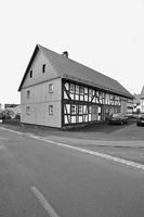 Großer Streckhof in hervorragendem Erhaltungszustand und von hoher städtebaulicher Wirkung am östlichen Ortseingang zwischen der Backhausstraße und der Straße Am Hag. Dem Gefügebild nach ist ein Wohn-Stall-Haus des sehr frühen 18. (oder noch 17.) Jahrhunderts mit dem Anbau eines Scheunentrakts und einer Vergrößerung des Stalls um die Mitte des 19. Jahrhunderts zur bestehenden Hofform erweitert worden. Der - im Erdgeschoss vorsichtig erneuerte - Wohntrakt ist in der einfach verriegelten Mann-Form verstrebt, das betonte Quergebälk mit Taustäben blieb über dem erneuerten Erdgeschoss erhalten. Der Wirtschaftstrakt zeigt ein Gefüge mit Dreiviertelstreben und kurzen Halsriegeln an Bund- und Eckständern, die durch beide Geschosse durchlaufen. Das Element des zierenden Taustabs wurde von den Füllhölzern des Wohnteils auf merkwürdige Art beim Wirtschaftstrakt fortgesetzt. Die breite Stallfassade aus Basalt und Sandstein fügt sich in das bemerkenswerte Gesamtbild.