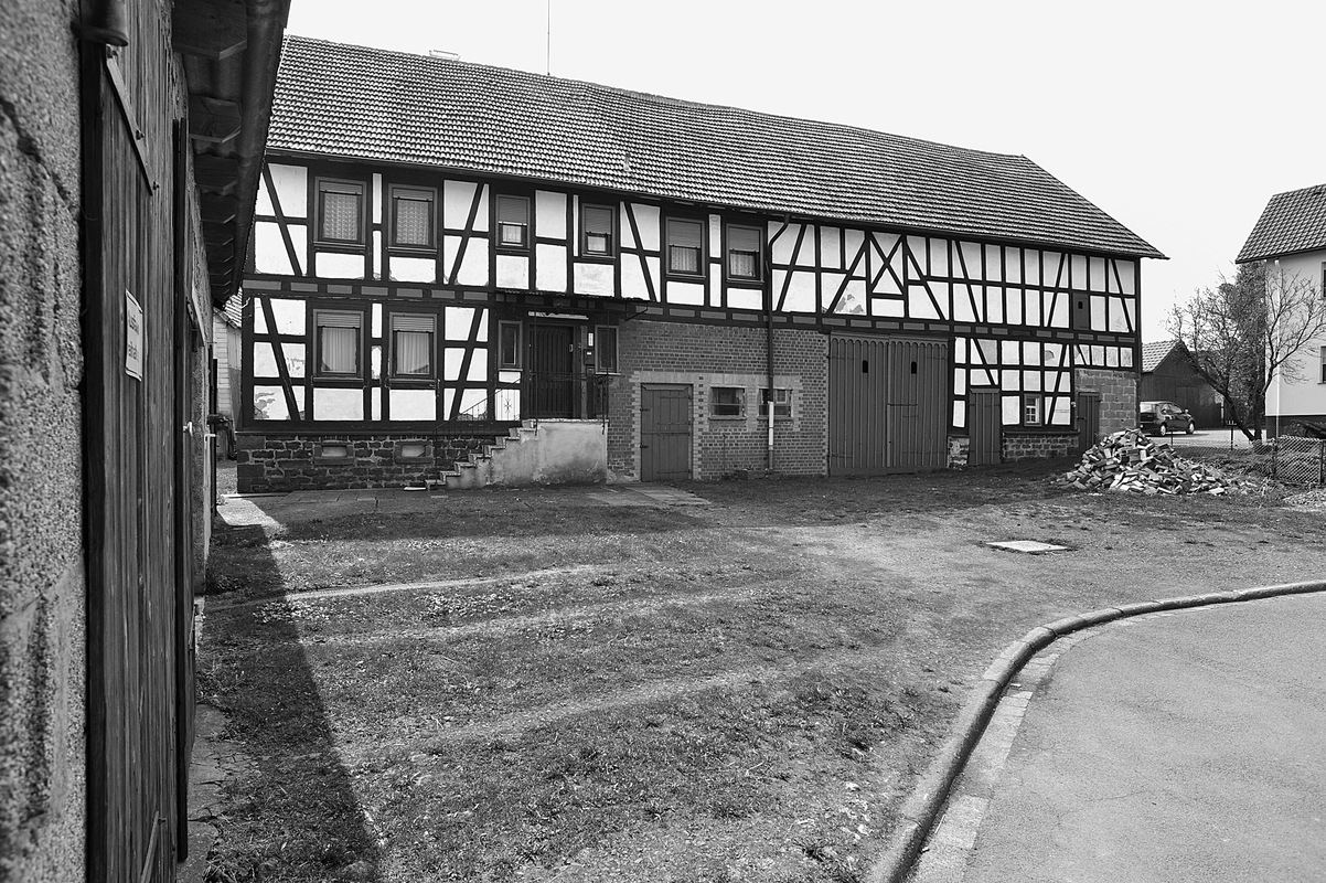 Der große Einhof zu sechs Zonen entstand zu Anfang des 20. Jahrhunderts und ist gekennzeichnet durch ein regelmäßiges konstruktives Fachwerk mit Geschossstreben, das im unteren Geschoss zweifach, im oberen einfach verriegelt ist und über dem Tennentor das zeittypische Andreaskreuz aufweist. Bemerkenswert ist die ganz traditionelle Aufteilung des Gebäudes; nur Stall und Bansenzone sind erneuert worden.