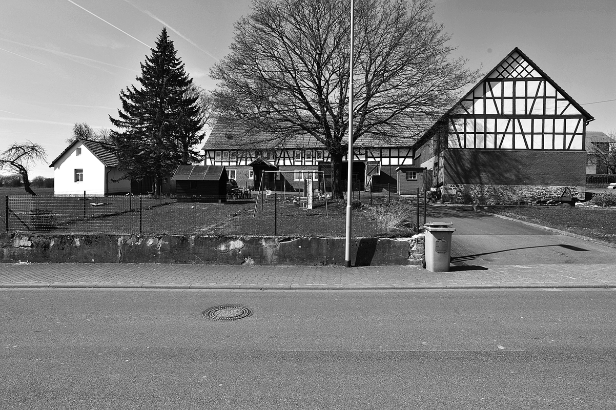Ein im Kern wohl aus dem späten 19. Jahrhundert stammender großer Einhof steht traufständig oberhalb der Straße. Er weist ein sehr einfaches konstruktives Fachwerk auf, das Erdgeschoss ist mit Holzschindeln verkleidet. Der Hof ist im frühen 20. Jahrhundert um einen im rechten Winkel angebauten Wirtschaftstrakt erweitert worden. Sein zur Straße exponierter Giebel zeigt über gemauertem Stallgeschoss ein ebenfalls konstruktives Fachwerk, das oberhalb des Kehlbalkens durch ein Rautenmuster akzentuiert ist.