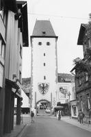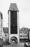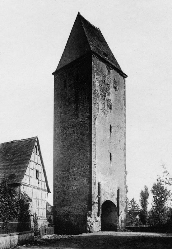 Verputzter Schalenturm mit Eckquaderung und Rahmung des Torbogens in Sandstein. Über hohem Durchfahrtgeschoss vier Obergeschosse mit Schießscharten und zwei rechteckigen Fenstern in Sandsteingewänden. An der Außenseite sind die Schienen für das Fallgatter in Sandstein erhalten. Als Turmhelm hohes Walmdach mit kleiner Lüftungsgaube.