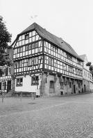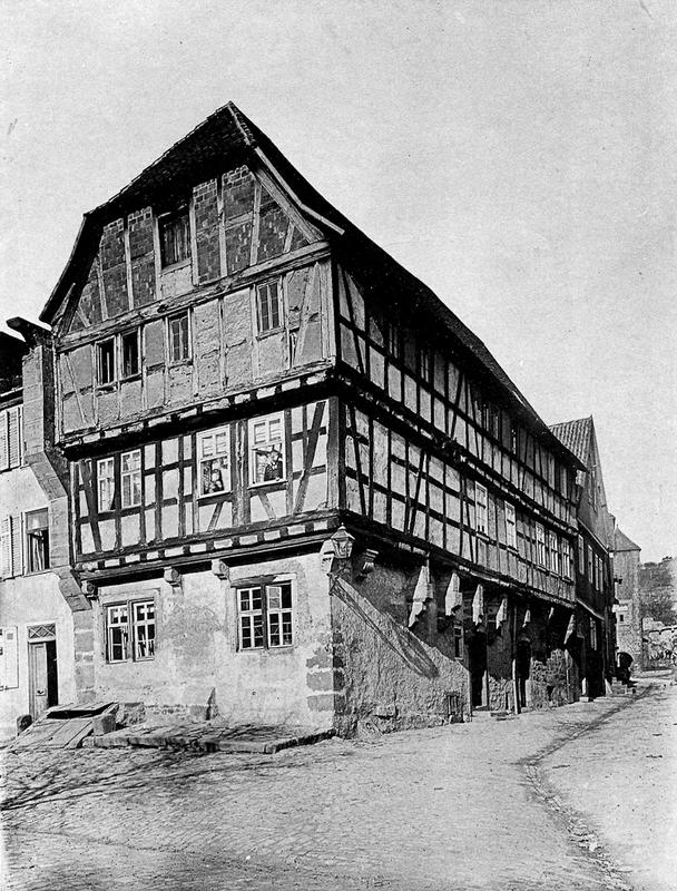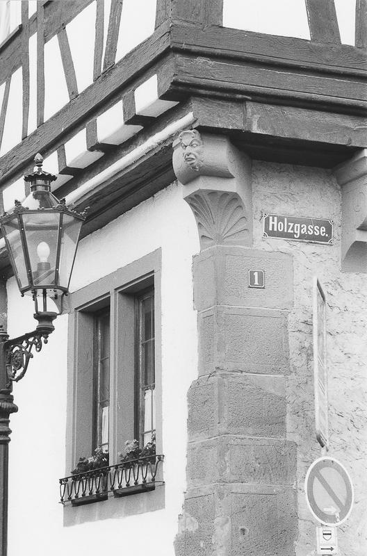 In repräsentativer Ecklage am Obermarkt dreigeschossiges Wohnhaus mit massivem Erdgeschoss und Giebelmauern, inschriftlich auf 1533 datiert. Die weit vorkragenden Fachwerkgeschosse auf teilweise profiliertem Schwellenkranz im späten 17. Jahrhundert auf den alten Renaissancekonsolen neu errichtet. Erdgeschoss und Giebelwände in Formen der Renaissance, die Eckquaderung mit Randschlag und grob gepicktem Spiegel, die Konsolen mit aufwändigem Beschlagwerk, an der Eckkonsole eine Maske. Im Erdgeschoss Fenster in gefasten Gewänden, teilweise noch in spätgotischen Formen. Auf der Giebelseite im Kellersockel ein breiter, liegender Kellerhals, Krüppelwalmdach mit kräftigem Aufschiebling.