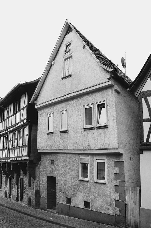 Zweigeschossiges, giebelständiges Wohnhaus zu zwei Achsen. Auf massivem Erdgeschoss ein leicht auskragendes Obergeschoss in verputztem Fachwerk. Im Erdgeschoss Eckquaderung aus Sandstein sichtbar, über der Haustür Stein mit Datierung 1440. Unter dem dicken Putz ist ungestörtes Fachwerk aus dem späten 17. oder dem 18. Jahrhundert zu vermuten.