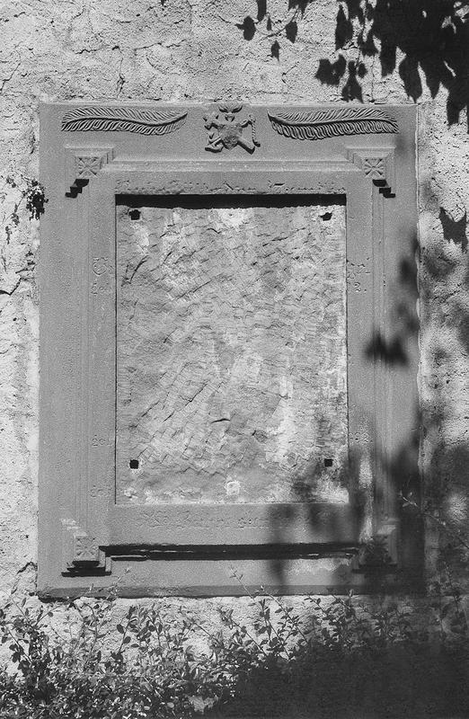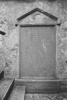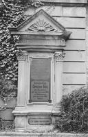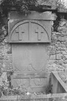 2) Sandsteinrahmen mit Palmwedeln, einem Herz, Anker und Kreuz in Wappenform kombiniert. Innen war in einen verkröpften profilierten Rahmen eine Schrifttafel vermutlich aus dunklem Granit eingelassen, die inzwischen fehlt. Am Rand sind einige Daten aus dem ausgehenden 19. Jahrhundert erkennbar.