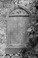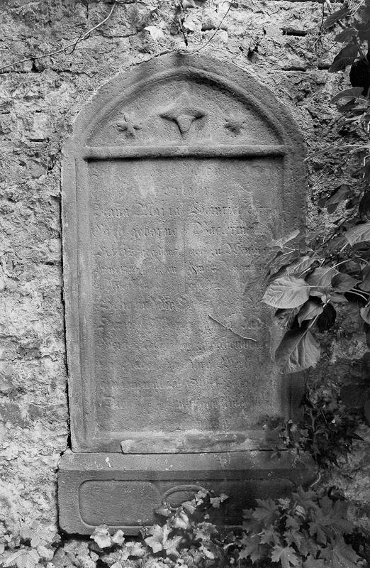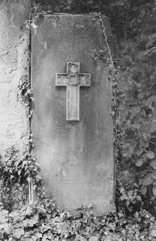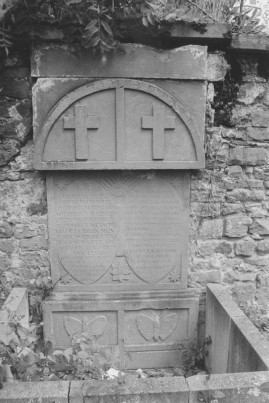 4) Hochrechteckige gerahmte Sandsteinplatte mit neogotischem, spitzbogigem Abschluß auf flachem Sockel. Im Bogenfeld schwach erkennbarer, vierzipfliger Stern, Die Schrift auf der Tafel ist nicht mehr lesbar. Das Grabmal dürfte aus den sechziger Jahren des 19. Jahrhundert stammen.