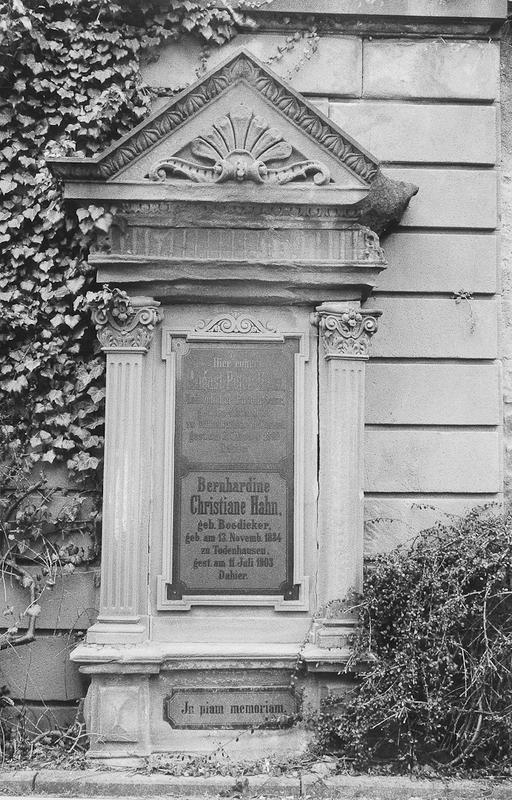 8) Grabmal des kaiserlichen Postdirektors August Peter Hahn und seiner Ehefrau Bernhardine, 1893. Aufwändige Ädikula vor einer gebänderten Sandsteinwand. Im Gegensatz zu den schlichten, spätklassizistischen Ädikulen der Nachbargräber sind die Kapitelle der Pilaster und der Giebel im Stil des Historismus stark plastisch mit antiken Ornamenten geschmückt. Im Zentrum eine schwarze Granitplatte mit den Namen der Verstorbenen.