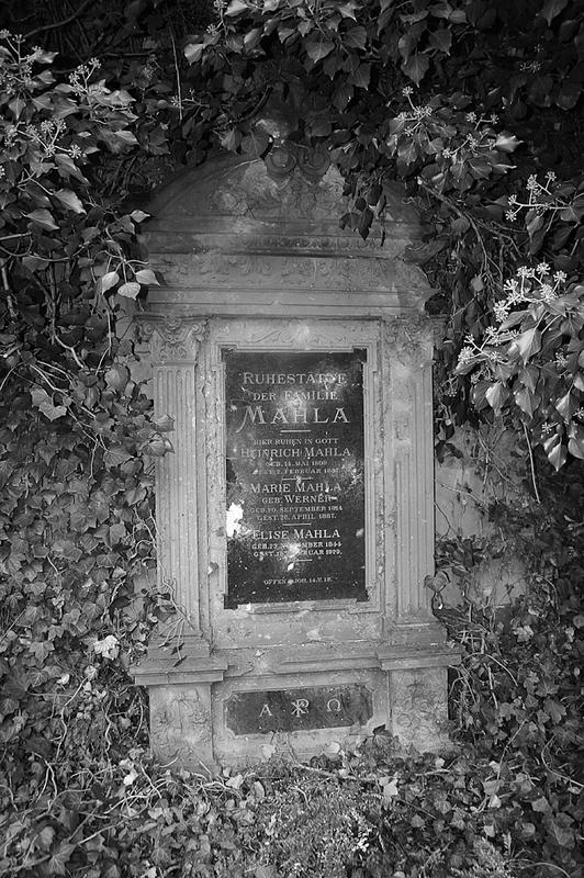 11) Grabstätte der Familie Mahla von 1887. Sandsteinrahmung in Form einer reich dekorierten Ädikula mit rundbogiger Verdachung. Im Sockel und Mittelteil schwarze Granitplatten mit den Namen der Verstorbenen.