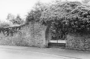 Sandsteinmauer mit rundbogigen Durchgang, Sandsteintreppe und schmiedeeisernem Torgitter. Der Zugang führte in den ehemaligen Stadtfriedhof, der sich südlich erstreckte.