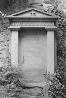 7) Grabstätte in Form einer tiefen Grotte aus Lungenbasalt; im Inneren Sandsteinplatte mit Anker und Kreuz - Glaube und Hoffnung - über einer wappenförmigen Tafel, die ehemals die Namen der Toten trug.