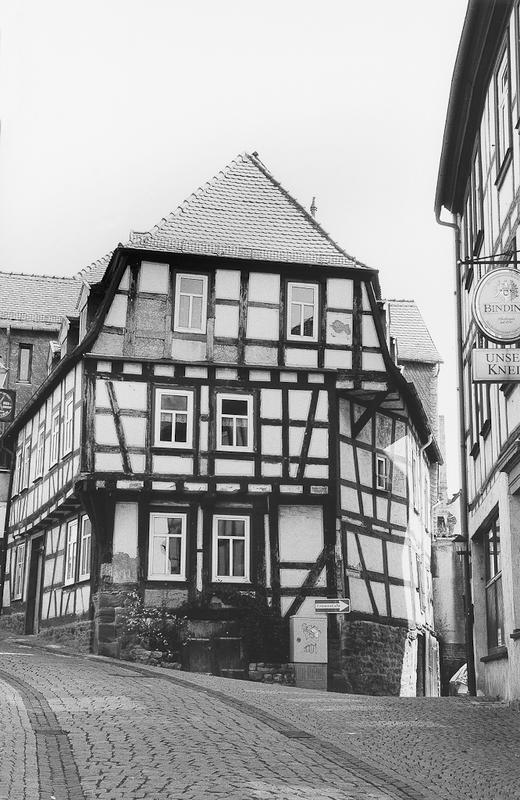 Breiter Kopfbau mit zwei Fachwerkgeschossen auf trapezförmigem Grundriss auf der Ecke von Röther Gasse und Herlengasse. Die Ersterbauungszeit von 1339 ist nur mit Vorbehalt möglich, die heute sichtbaren Teile datieren in Umbauphasen 1686 und 1723 (dendrodatiert Büro Tisje, 2000). Kräftiges Fachwerkgefüge in schlichten Formen mit Diagonalstreben und Doppelständern, Obergeschoss zweiseitig auf Bügen weit auskragend. Hohes Dach mit Aufschiebling, traufseitig mit Mansarden, giebelseitig nur abgewalmt.