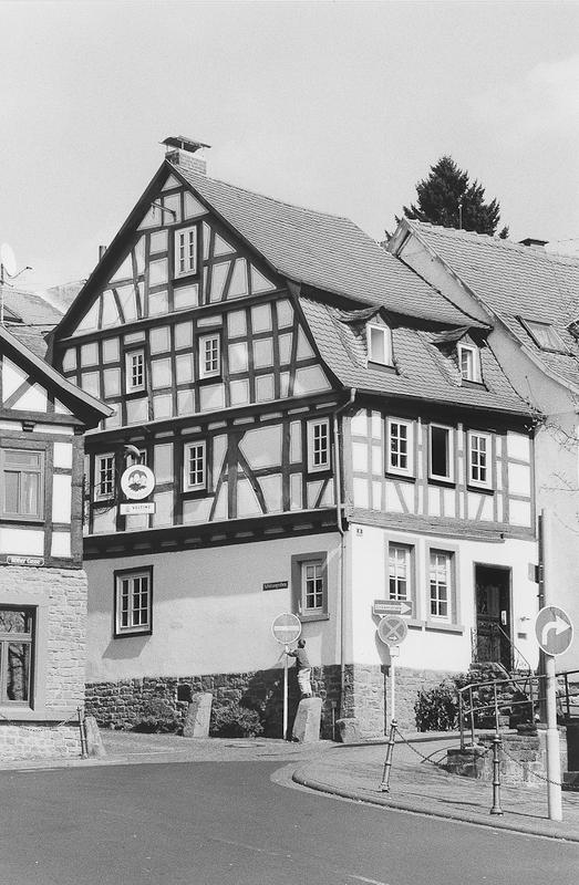 Zweigeschossiges, dreiachsiges Wohnhaus aus dem 18. Jahrhundert in Ecklage. Auf hohem Sandsteinsockel ein verputztes, massives Erdgeschoss mit Sandsteingewänden, darüber ein Fachwerkgeschoss in den typischen Formen des 18. Jahrhunderts mit Doppelständern, kurzen Diagonalstreben in den Brüstungen und beschnitztem Kopfeckblatt am Eckständer. Giebelseitig profiliert verbretterte Rähmzonen Mansarddach mit zwei Gauben traufseitig. Erschliessung über hohe Sandsteintreppe.