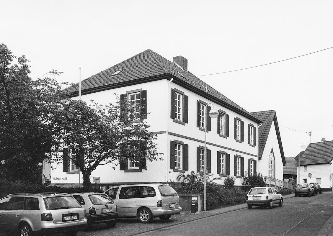 Fünfachsiger, zweigeschossiger Massivbau in spätklassizistischen Formen mit flach geneigtem Walmdach, erbaut 1847/48 von Landbaumeister Karl Arnd. Streng gegliederter Putzbau auf Kellersockel aus Sandsteinquadern. Horizontales Simsband und hochrechteckige Fenster in Sandsteingewänden mit Klappläden. Am Sockel auf 1848 datiert.