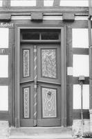 Sehr schöne klassizistische Haustür mit Oberlicht in profiliertem Futter. Zweiflügelige Kassettentür mit Mittelstock, Rankenbemalung und alten Beschlägen.