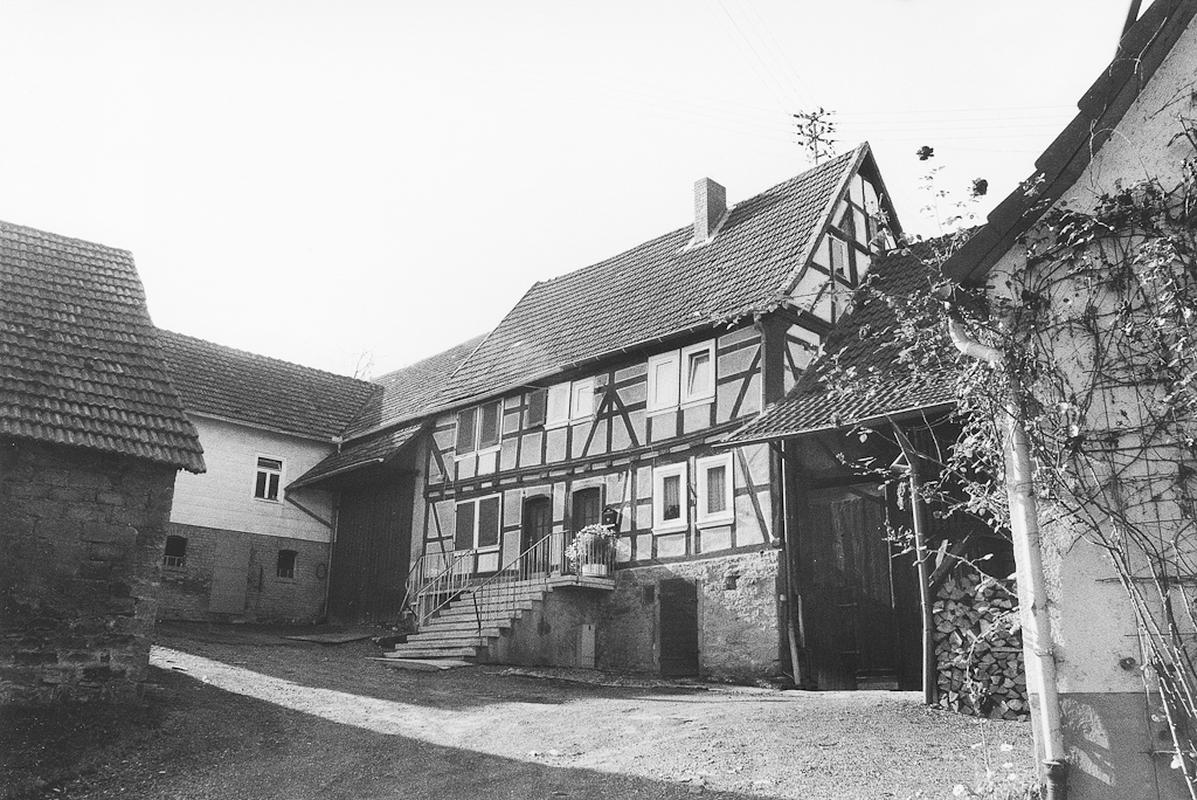 Das zweigeschossige Doppelwohnhaus schließt mit den beiden flankierenden Scheunen die Südseite des Hofes. Traufständiger Bau mit zwei Geschossen in einfachen Sichtfachwerk auf hohem Stallkeller. Obergeschoss auf profilierter Rähm, an Eck- und Bundständern breit gestellte Vorformen von Mannfiguren. Erschließung in der Mittelachse über hohe Freitreppe. Scheune und Holzschuppen teilweise mit Wettbrettern verkleidet, trauf- und rückseitig ist die stark abgewitterte Lehmstakung des Fachwerks mit Lehmstrohputz sichtbar. Gegenüber dem Wohnhaus eingeschossiger Sandsteinbau, mit Nr. 2 im Katasterplan bezeichnet. Auf der gesamten Hoffläche ist altes Pflaster erhalten. Die große, das Ortsbild prägender Hofanlage ist als Sachgesamtheit geschützt.