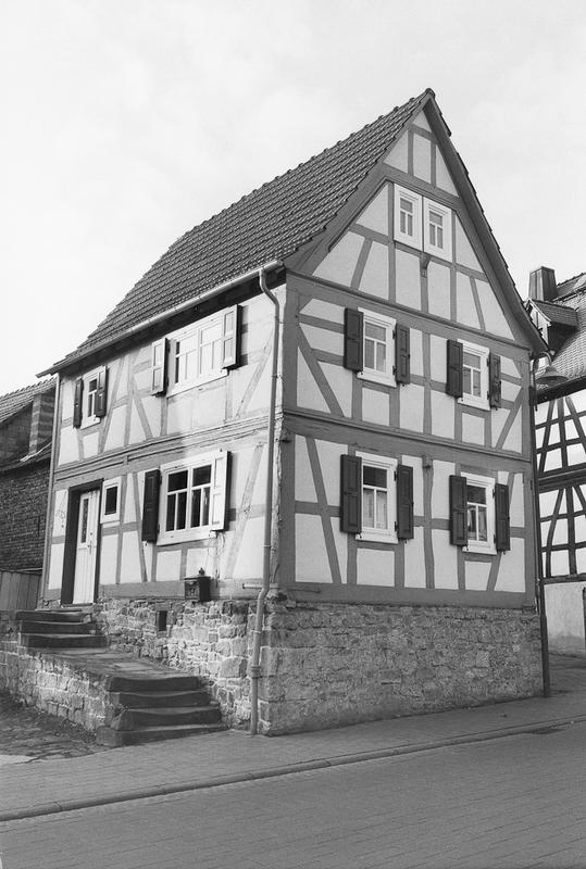 Auf hohem Sandsteinsockel giebelständiges Wohnhaus, wohl Altenteiler, mit zwei Fachwerkgeschossen aus der ersten Hälfte des 18. Jahrhunderts. Giebel- und Traufseite zweiachsig, traufseitig mit je zwei gekuppelten Fenstern in der Ostachse und der Erschliessung in der Westachse. Fachwerk mit Mannfiguren, Halsriegeln und profilierten Rähmzonen, Giebel ebenfalls profiliert gerahmt. Zugang über eine lange Sandsteinrampe mit zwei Treppenabschnitten parallel zum Haus.