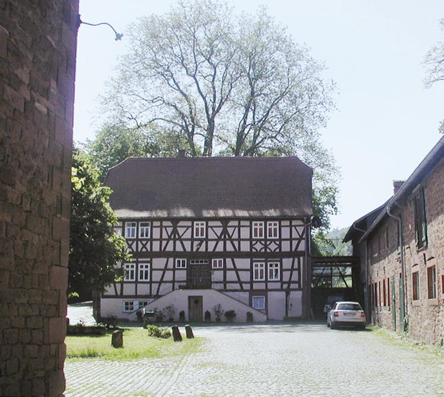 Herrenhaus: zweigeschossiges, traufständiges Fachwerkwohnhaus auf hohem Kellergeschoss, Giebelwände im Erdgeschoss massiv und verputzt, Eckquaderung und leicht abgefaste Fenster- und Türgewände in Sandstein, im Obergeschoss Sichtfachwerk mit Mannfiguren an Eck- und Bundständern, profiliertem Schwellenkranz, negativen Rauten in den Brüstungsfeldern und profiliertem Ortgang, Krüppelwalmdach mit Aufschiebling. Traufseite achsensymmetrisch in drei Achsen gegliedert, die Außenachsen mit je zwei gekuppelten Fenstern. Erschliessung in der Mittelachse über zweiläufige Außentreppe mit integriertem Kellerhals, zweiflügelige Haustür mit Kassetten und vierfach geteiltem Oberlicht, flankiert von kleinen Flurfenstern. Seitlich des Eingangs Schwengelpumpe.