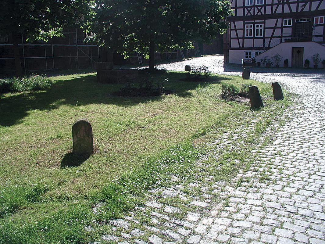 Hofpflaster im vorderen Hof bogenförmig in Blaubasalt, im hintern Hof Sandsteinpflasterung und verschiedene Prell- und Grenzsteine in Zweitverwendung im Hof aufgestellt, zum Teil mit Inschrift GH (Großherzogtum Hessen) und 1865.