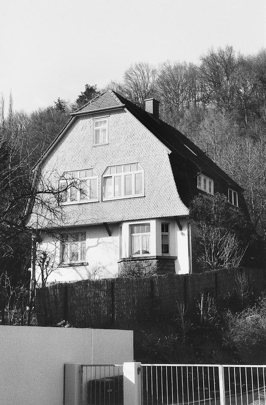 Zwischen den historistischen Wohnhäusern der Gegend das erste Landhaus im Heimatstil. Die Ähnlichkeit der Kubatur und des Dachaufbaus mit Haus Nr. 41 lässt die Vermutung zu, dass dieses Haus ebenfalls um 1909/10 von der Fa. B. Odenwald & Sohn gebaut wurde. Unter der Verschindelung ist aufwändiges historistisches Fachwerk zu erwarten.