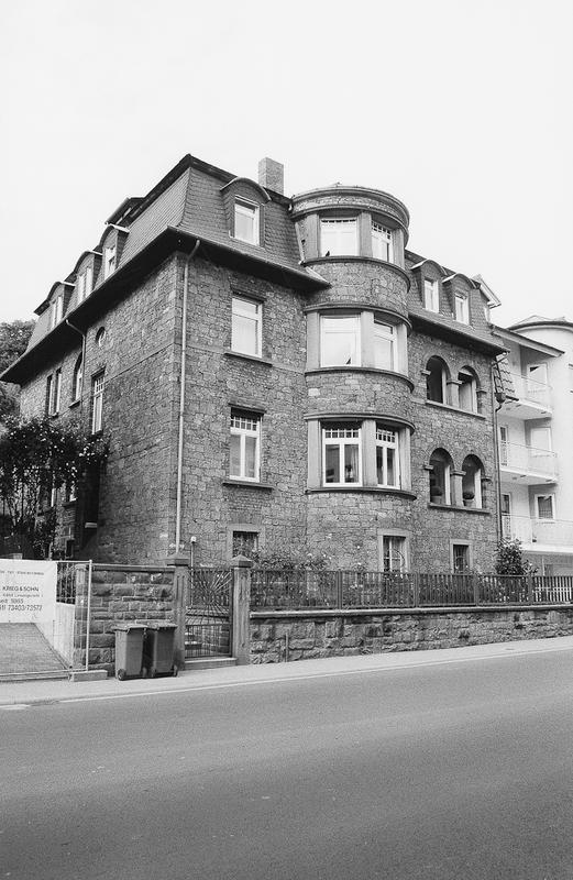 In einem Vorgarten dreigeschossiges Mehrfamilienhaus aus dem letzten Viertel des 19. Jh. Der große Sandsteinbau mit rundbogigen Loggien in der Außenachse wirkt durch einen halbrunden, durchfensterten Altan, der sich bis in das Mansarddach fortsetzt, noch gewaltiger und sprengt endgültig die Zweigeschossigkeit der Straße. Im ersten Obergeschoss sind die zweiflügeligen Fenster mit kleinteiligem Oberlicht aus der Erbauungszeit erhalten. Sie mildern sichtbar die Dimension des Gebäudes.
