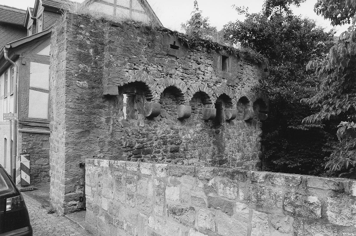 Rest des 1479 fertiggestellten Obernhäuser Tores, das in Nordosten die Verbindung zur Stadt und zur Reichsstraße herstellte. Bogenförmiges Mauerstück in Sandstein mit Brustwehr über einem Bogenfries und verschiedenen Schießscharten.