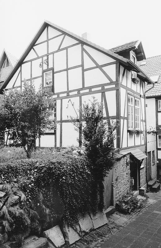 Auf die Einfriedungsmauer aufgesetzt, traufständiges, einachsiges Wohnhaus mit massivem Erdgeschoss und hohem Fachwerkobergeschoss aus dem 19. Jahrhundert Im ersten Obergeschoss gekuppelte, zweiflügelige Fenster mit geteiltem Oberlicht in Holzrahmung. Satteldach mit Kniestock und Zwerchhaus.