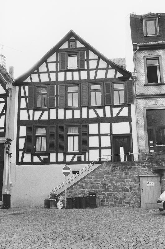 Giebelständiges, zweigeschossiges und vierachsiges Wohnhaus aus dem 19. Jahrhundert in schlichtem Fachwerk, auf älterem, hohem Kellergeschoss. Satteldach mit Aufschiebling. Erschliessung in der rechten Achse über hohe, öffentliche Aussentreppe, die zur Peterskirche führt.