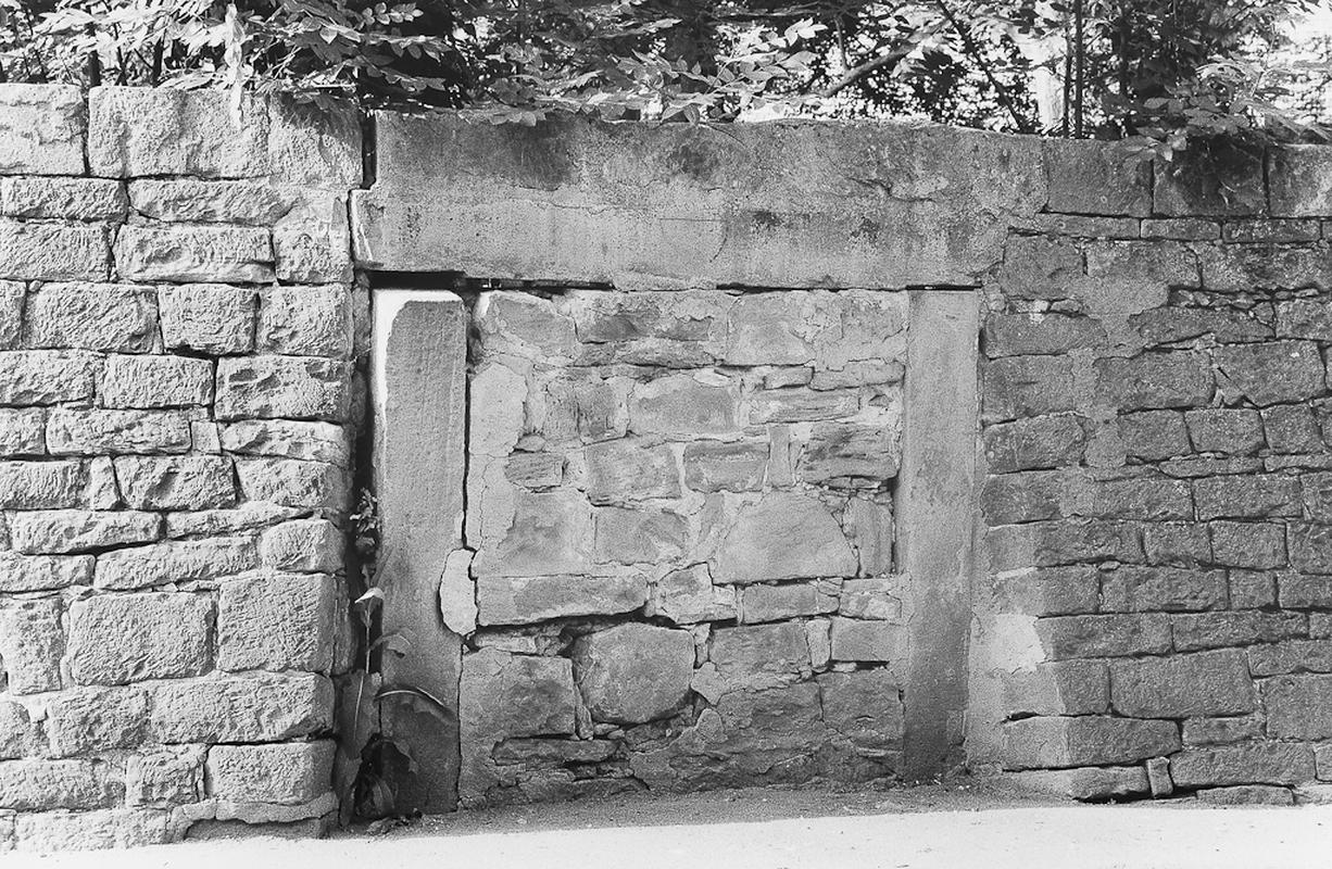 Die Anlage wird von einer Sandsteinmauer mit giebelförmigen Abschluss eingefriedet. In der Südseite zugesetztes, schlichtes Torgewände, im Sturz datiert auf 1825.