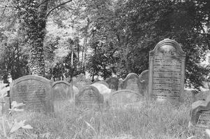 Unter hohen Bäumen eine dichte Ansammlung von Grabplatten aus Sandstein, meist barock dekoriert. Ein großer Teil der Platten ist heute in der Erde versunken. Der vordere, an der Straße liegende Teil des Friedhofs liegt deutlich höher, was auf eine Doppelbelegung hin weist.