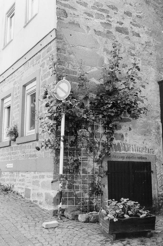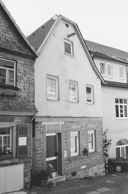Giebelständiges, zweigeschossiges und dreiachsiges Wohnhaus mit steilem Krüppelwalmdach aus dem 18. Jahrhundert. Traufseite in Sandstein, offensichtlich von mittelalterlichem Vorgängerbau. Mauer des Erdgeschosses im 19. Jahrhundert in Sandsteinquadern vorgesetzt. Fassade im Bereich von Obergeschoss und Giebel modern verputzt, darunter einfaches Fachwerk, im Giebel mit Andreaskreuzen im Brüstungsbereich. Fenster im Giebel ehemals Ladeluke mit Holzladen. Kellereingang in der Traufseite.