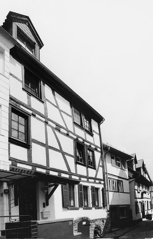Traufständiges, zweigeschossiges Doppelhaus aus dem 19. Jahrhundert. Auf massivem Erdgeschoss zwei Fachwerkobergeschosse, bei Nr. 24 mit Eternitschindeln behängt. Bei Haushälfte Nr. 22 ist das schlichte, sparsam verriegelte Fachwerk des frühen 19. Jahrhunderts zu erkennen.