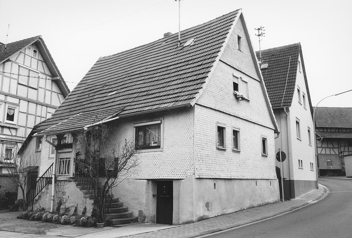 Kleines, eingeschossiges Wohnhaus aus der ersten Hälfte des 19. Jahrhunderts auf hohem, massiven Kellersockel, giebelständig zur Straße, ursprünglich als Wohnhaus einer Hofreite zur Scheune gegenüber gehörig. Der kleine Fachwerkbau ist komplett mit Rundschindeln verkleidet und wird erschlossen über die ortstypisch hohe, zweiläufige Sandsteintreppe unter angeschlepptem Vordach.