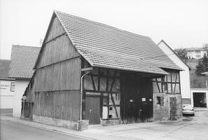 Gegenüber Fachwerkstallscheune aus der ersten Hälfte des 19. Jahrhunderts. Stallbereich aus Sandsteinquadern und Feldbrandziegeln mit alter, zwerchgeteilter Stalltür. Altes Scheunentor mit Langband und Drehangeln aus Sandstein. Fachwerk zum Teil mit Lehmziegeln, größtenteils mit Lehmstakung und Lehmstrohputz ausgefacht. Giebelseite mit Langschindeln verkleidet. Weitgehend original erhaltene Scheune.