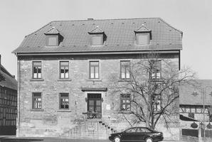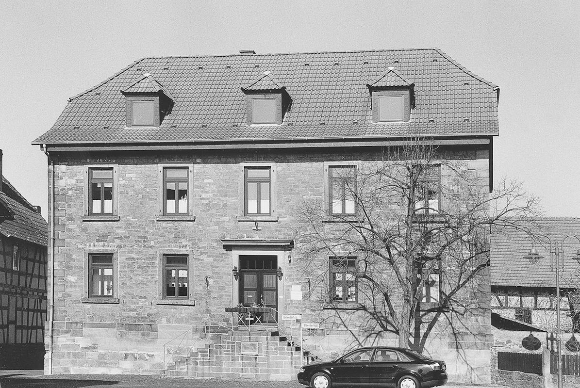 In der Sichtachse der Rathausstraße die ehemalige Schule, 1843 durch Landbaumeister Arndt in schlichten, klassizistischen Formen errichtet. Auf hohem Sockel aus sorgfältig behauenen Quadern ein traufständiger, zweigeschossiger Sandsteinbau mit Eckquaderung. Symmetrische Gliederung der Fassade in fünf Achsen, die schlichten Tür- und Fenstergewände in Werkstein. Erschliessung in der Mittelachse über zweiläufige Außentreppe und zweiflügelige Tür mit profilierter Verdachung. Krüppelwalmdach mit Aufschiebling und modernen Gaubenhäuschen. Typischer, sehr harmonischer Schulbau der Zeit.