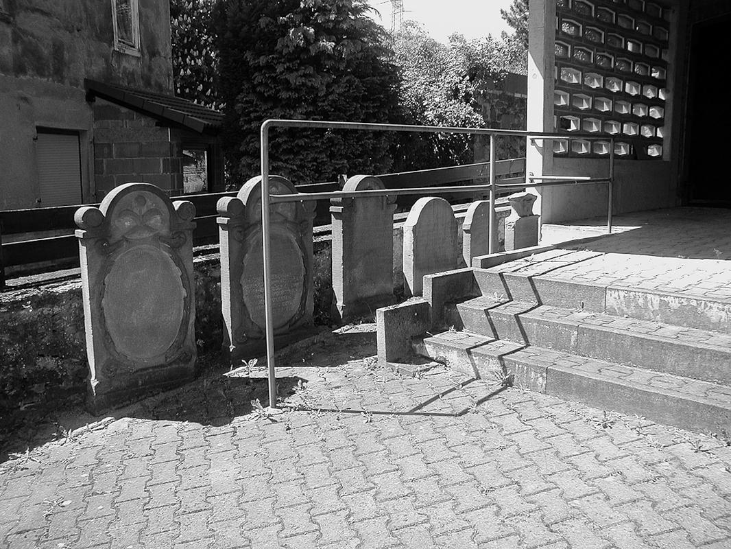 Die Grabplatten wurden leider sehr unschön zwischen Betonpflaster und ohne Schutz gegen die Witterung hier aufgestellt.