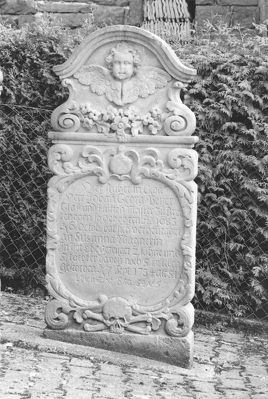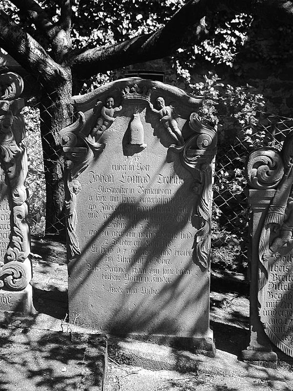 Der Zugang zur Friedhofskapelle wird flankiert von zwei Reihen von insgesamt 14 Grabsteinen aus der Zeit zwischen 1677 und 1809 aus hochrechteckigen Sandsteinplatten, zum Teil in reichen barocken Formen mit Zunftzeichen der Glasmachermeister der Breitenborner Glashütte. Darunter auch der Grabstein von Johann Jost Gemmer, gräflicher Wächtersbacher Schultheiß und Gastwirt, gest. 1751, mit dem Zunftzeichen der Bierbrauer.