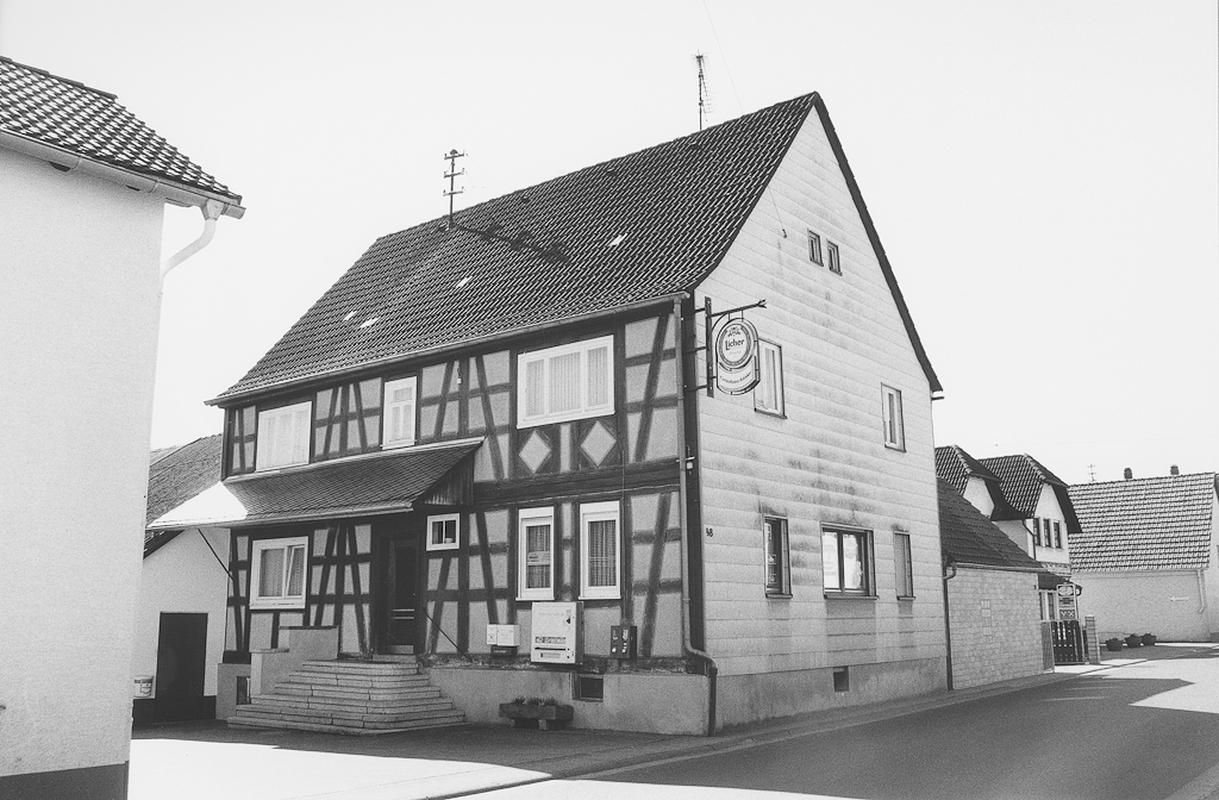 Giebelständiges, zweigeschossiges Wohnhaus aus der Mitte des 18. Jahrhunderts in Sichtfachwerk mit negativen Rauten in den Brüstungsfeldern und hohen Diagonalstreben. Symmetrische, dreiachsige Fassadengliederung mit Erschliessung in der Mittelachse und ehemals zwei gekuppelten Fenstern in den Außenachsen. Giebel unter Eternitverkleidung vermutlich in weitgehend ungestörtem Fachwerk, kleine Giebelfensterchen im Dachgeschoss erhalten, Satteldach mit Aufschiebling.