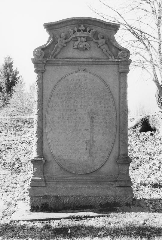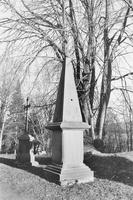 Vor einer Gruppe von Linden klassizistisches Grabmal von 1828 in Form eines schlichten Obelisken mit Kugelbekrönung auf einem Sockel mit profilierter Plinthe und einer Kyma als Dekor. Auf dem Sockel ein Schriftfeld mit eingezogenen Ecken und dem eingravierten Sterbedatum 1828.