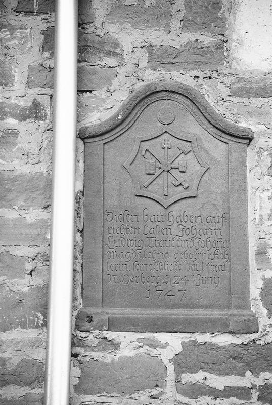 Querstehend große Stallscheune in Sandsteinquadern von 1747 mit Tür- und Fenstergewänden in Sandstein, Lage und Anzahl der Scheunentore der modernen Nutzung angepasst. In die Wand eingelassen barocke Schrifttafel mit eingezogenem, rundbogigen Abschluss, dem Zunftzeichen der Bierbrauer und der Inschrift "Diesen Bau haben aufrichten laßen Johann Ludwig Traut und Johanna Magdalehna gebohrene Köherlin, seine eheliche Haußfrau, Neue Herberge Junij 1747“.
