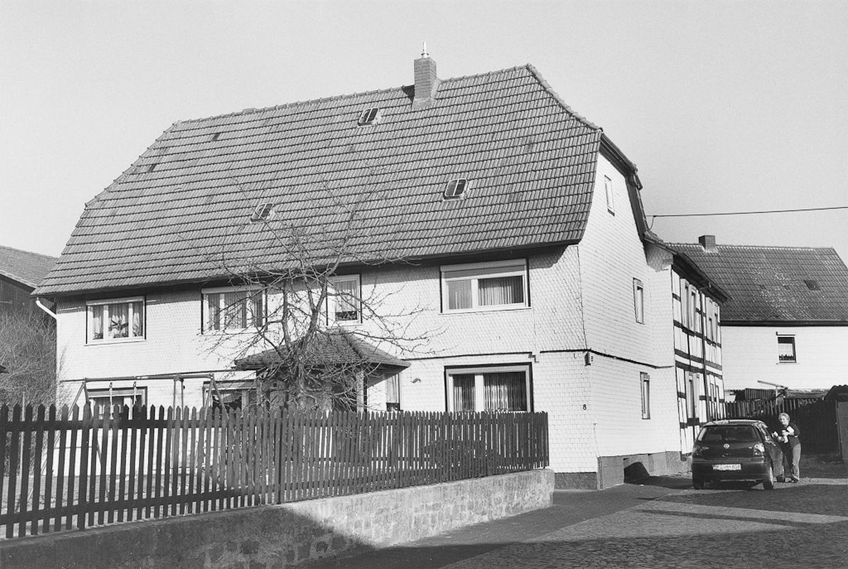 Traufständiges, zweigeschossiges Wohnhaus aus dem 18. Jahrhundert auf niedrigem, Sockel komplett mit Hirschzungen- bzw. Kurzschindeln verkleidet, darunter wohl nahezu ungestörtes Fachwerk, hohes Krüppelwalmdach mit Aufschiebling. Vierachsige Traufseite, die ehemals gekuppelten Fenster modern umgebaut. Erschliessung über einhüftige Außentreppe, modernisiert.