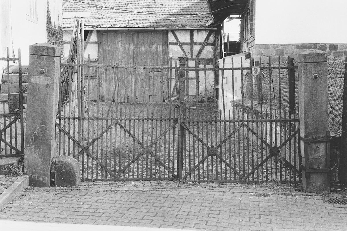 Hofabschluss durch bauzeitliches, eisernes Staketentor zwischen quadratischen Sandsteinposten mit pyramidalem Abschluss. Im Hof Bogenpflaster aus Basalt und Schwengelpumpe.