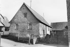 Eingeschossiges, giebelständiges verschindeltes Fachwerkwohnhaus auf hohem Kellergeschoss in Sandsteinquadern, Satteldach mit Aufschiebling. Alte Galgenfenster in Holzfutter erhalten, am Giebel Fenster mit Bleisprossen und unten liegendem Fensterstock. Im Spitzgiebel Luftöffnung von Klappladen mit geschmiedeten Langbändern geschlossen. Traufseite achsensymmetrisch dreiachsig mit zweifach gekuppelten Fenstern in den Außenachsen und zentraler Erschliessung über zweiläufige Außentreppe, zur Straße hin übergehend in eine lange, schräg ansteigende Rampe auf Sandsteinpodest mit schmiedeeisernem Gitter. Originale, zweiflüglige Haustür mit Lichtausschnitten erhalten. Auf einem hohen Sandsteinuntergeschoss mit Werkstatt o.ä. Anbau am rückwärtigen Giebel in identischen Formen. Rechtwinklig zum Wohnhaus befand sich eine Fachwerkscheune mit Stallteil in Sandstein, Satteldach mit angeschlepptem Vordach und Teilen alter Bieberschwanzdeckung. Heute abgebrochen.