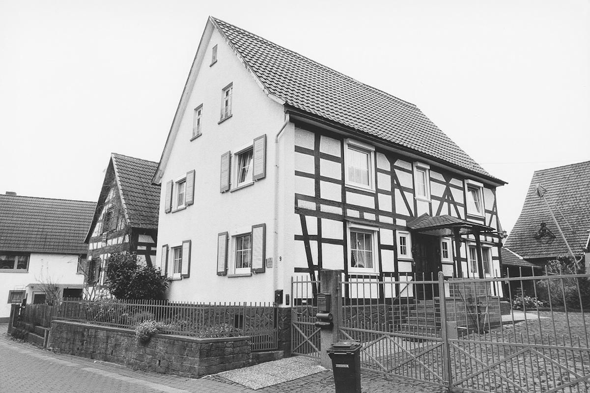Zweigeschossiges, giebelständiges Wohnhaus aus der Mitte des 18. Jahrhunderts auf massivem Sockel in teilweise verändertem Sichtfachwerk mit Mannfiguren. Giebel nachträglich massiv aufgeführt, Satteldach mit Aufschiebling. Hofseitige Erschliessung über einläufige Treppe, Haustür flankiert von hochgelegenen Flurfensterchen. Zur Straße kleiner Bauerngarten auf einer Stützmauer aus Sandsteinquadern. Einfriedung mit Metallstaketentor und Hofpflasterung in Blaubasalt erhalten. In dem Gebäude waren von 1894-1921 das Standesamt und das Gericht Gründau, von 1894-1919 das Bürgermeisteramt und von 1894-1945 die Post untergebracht.