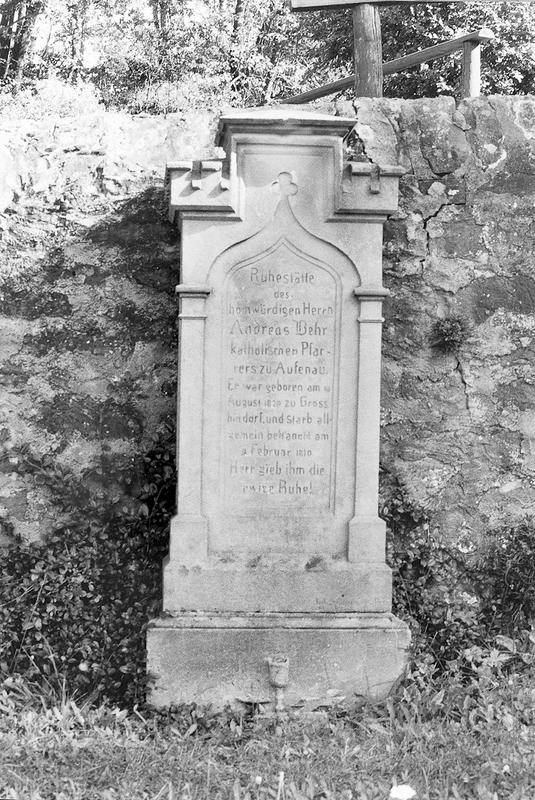 Grabmal des katholischen Pfarrers Andreas Behr von 1870. Rechteckige, Grabplatte aus hellem Sandstein, in neogotischen Formen dekoriert. Abschluß mit gestuftem Zinnen.