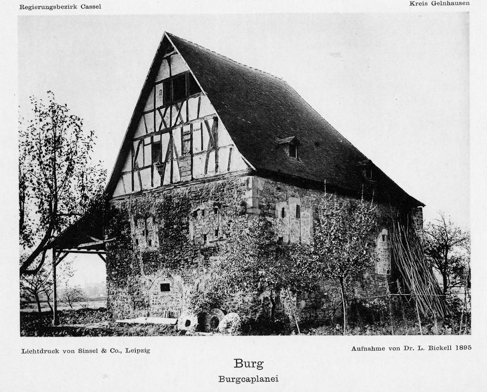 Zweigeschossiger Sandsteinbau, im 15. Jahrhundert als Kaplanei der Burggemeinde errichtet. Über einem ebenerdigen, tonnengewölbten Kellergeschoss ein Wohngeschoss, an der Ostseite gekuppelte spätgotische Fenster mit Vorhangbögen, traufseitig spitzbogiges Fenster. In der östlichen Giebelwand große Rundbogentür zum Kellergeschoss, 1630 zusammen mit dem Kellergewölbe eingebaut. 1840 wurde die Tür geschlossen und auf der Südseite ein Türgewände mitsamt Wappenstein von 1617 aus dem gleichzeitig abgebrochenen Burgsitz der Burggrafenfamilie von Forstmeister eingebaut. Das schlecht zusammengesetzte Gewände wurde 1974 gegen ein modernes ausgetauscht. Das Satteldach mit Aufschiebling einseitig nach Westen abgewalmt, zwei Dachgauben und Ladeluke.