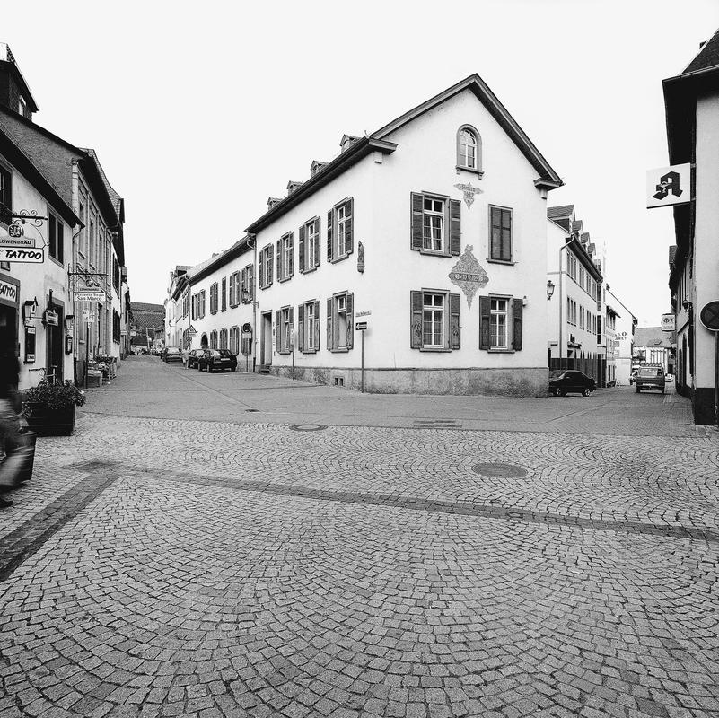 Auch als Scherr-Haus (nach einem Vorbesitzer) bekannter, langgestreckter, aus zwei Wohnhäusern zusammengesetzter Gebäudekomplex, der gegen Mitte des 19. Jhs. vereinheitlicht und in jüngerer Zeit durch die Stadtverwaltung genutzt wurde. Im Scheitelstein der rundbogigen Durchfahrt des nördlichen Bauteils soll sich (nach Inv. 1965) die Jahreszahl 1798 befunden haben. Der südliche Teil wurde im 19. Jh. angefügt. Einheitliche Putzfassade mit weitgehend gleichformatigen Fenstern in regelmäßigem Achsraster. Im Giebel ein Rundbogenfenster. Satteldach mit kleinen Gauben. Schlicht, jedoch an zentraler Stelle von starker stadtraumbildender Wirkung. Eine früher zugehörige Massivscheune mit hohem Mansarddach an der Winkeler Straße wurde nach 1974 abgebrochen und durch einen Neubau ersetzt.