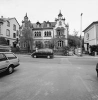 Nach Bauinschrift im gekuppelten Fenster über dem Balkon im Jahr 1900 errichtete Doppelvilla mit streng symmetrisch angeordneten Haushälften. Zwei schmale, leicht vorgezogene Risalite mit reichverzierten Giebeln in lebhaften Renaissanceformen und vorgesetzten Altanen fassen den architektonisch stark durchgegliederten Baukörper beidseitig ein. Gewände, Rahmungen der Bauteile und Giebelaufsätze in plastischer Bearbeitung aus rotem Sandstein bilden einen starken Kontrast zur hell verputzten Wand. Vorgarteneinfriedung aus massiven Pfosten mit Eisengitter. Bestandteil der Villengruppe gegenüber Schule und ev. Pfarrkirche.