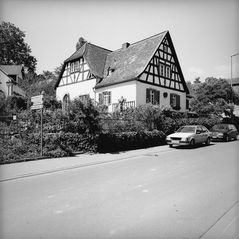 In einer Straßengabelung gelegenes Wohnhaus auf winkelförmigem Grundriss. An einen eingeschossigen, höheren Bautrakt mit Krüppelwalmdach schließt rechtwinklig ein Anbau mit Satteldach an. Im massiven, verputzten Erdgeschoss mit Sandsteingewänden eine spitzbogige Öffnung (in zweitverwendetem, ursprünglich aus Kiedrich stammendem Gewände). Die Giebel zeigen konstruktives Fachwerk. Von der ehemaligen Einfriedungsmauer existiert an der Südwestecke noch ein massiver Torbau mit Rundbogeneinfahrt; ein eiserner Gitterzaun schließt das vormals größere Grundstück dort ab, wo ein Nachbarhaus wegen der Straßenführung abgebrochen wurde.