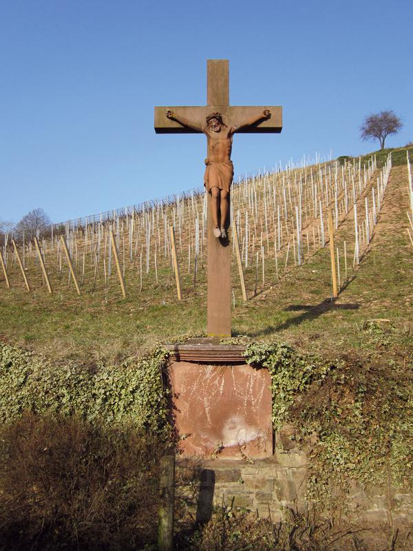 Wegekreuz gegenüber Im Grund 63 (Johannishof), Ergebnis der Erneuerung eines aus dem 18. Jh. stammenden Wegkreuzes aus Sandstein in etwas vereinfachter Form unter Verwendung originaler Teile (Deckplatte). Das ursprünglich gefaste Kreuz stand auf einem geschweiften Sockel mit Eckverzierungen und verwitterter Inschrift (rest. 1895). Der Sockel verfiel nach Einbindung in die Weinbergsmauer. Wiederherstellungen fanden 1960, 1985 und 1992 statt.