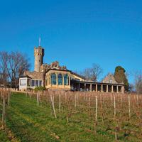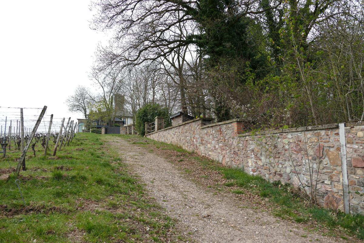 Nördlich oberhalb des Ortes an einem Hang vor dem Waldrand gelegen, erscheint die „Burg" als malerisches Gebilde inmitten der Rebenlandschaft. Ursprünglich fast nur Kulisse, bestehend aus einem Rundturm mit anschließender langgestreckte Mauer, die teilweise als Pallaswand mit Giebel ausgebildet ist und mit Zinnen und Maßwerk-Spitzbogenfenstern gotisierende Motive enthält; davor eine Renaissance-Loggia. Moderne An- und Ausbauten. Hinter dem Gebäude liegt der zugehörige, ausgedehnte Park mit geringen Resten historischer Pflanzungen, Wegeführungen und Mauereinfriedung, darin ein neuer Hotelbau.Zugehörig ein freistehender Rundturm auf dem rückwärtigen bewaldeten Grundstück (Flurstück 178/1). Bruchsteinmauerwerk mit Portal, das von einem offenen Rundbogen überfangen wird, und spitzbogigen Sandsteinfenstern, oberer Abschluss mit einem leicht vorkragenden Zinnenkranz, darunter Rundbogenfries.