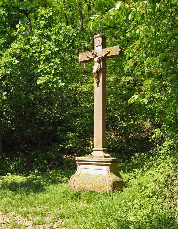 Standort am alten Wallfahrtsweg nach Nothgottes im Blaubachtal unterhalb des Bienenbergs. Hohes Sandsteinkreuz mit Kleeblattenden auf geschwungenem, verziertem Sockel, nach Inschrift "gestiftet von Rosina Haenin ledigen Standes 1801". 1992 umfassend restauriert, Korpus ersetzt, 2006 erneuert.